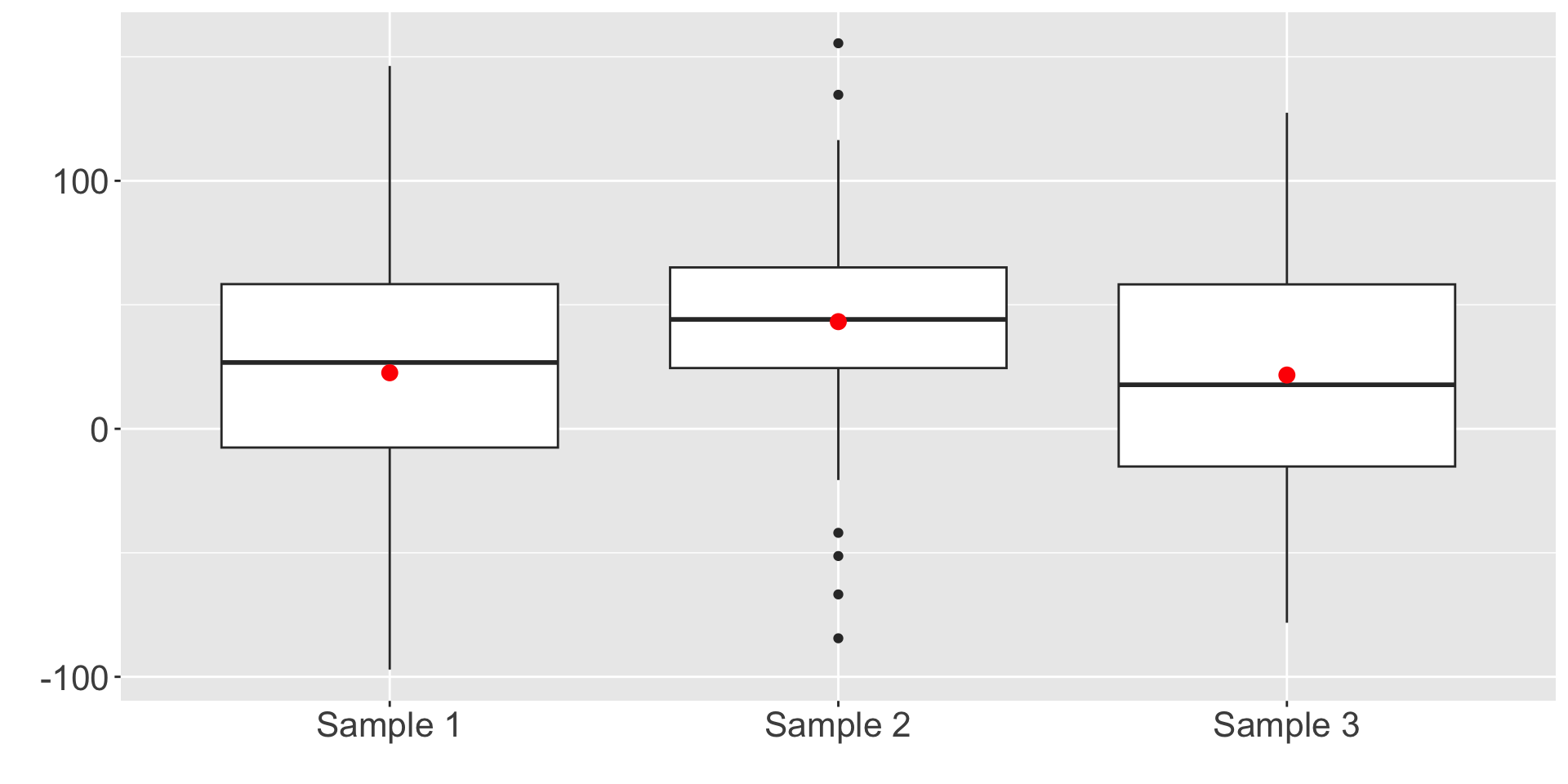 In each of the side-by-side boxplots below, youโll see data sampled from three different populations. The red dot in each plot corresponds to the sample mean.
