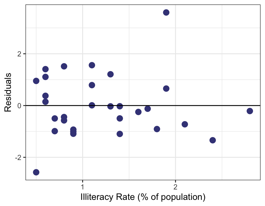 \[\hat{y} = 72.181 - 1.146x\] where \(\hat{y}\) is the predicted average life expectancy and \(x\) represents illiteracy rate.