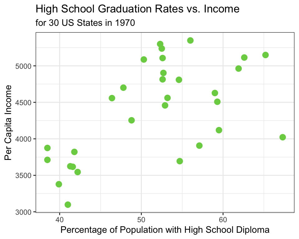 🗣 Describe the relationship between high school graduation rate and income using the scatterplot above.