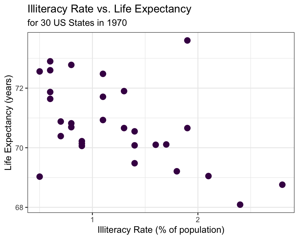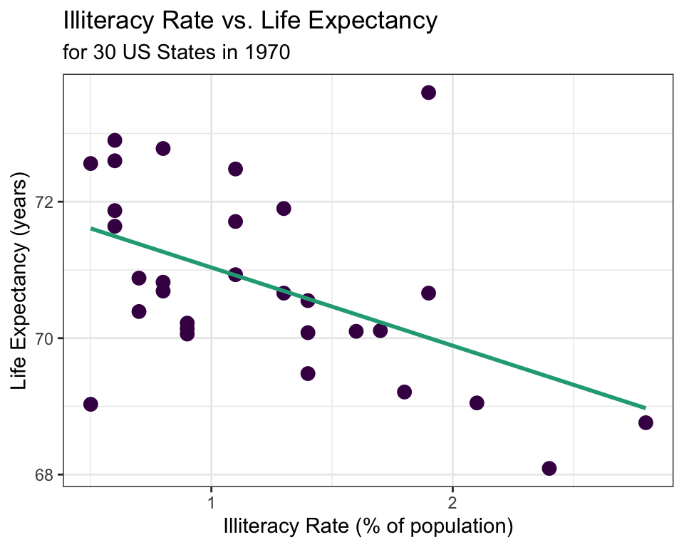 lm(LifeExp ~ Illiteracy, data = state_30)